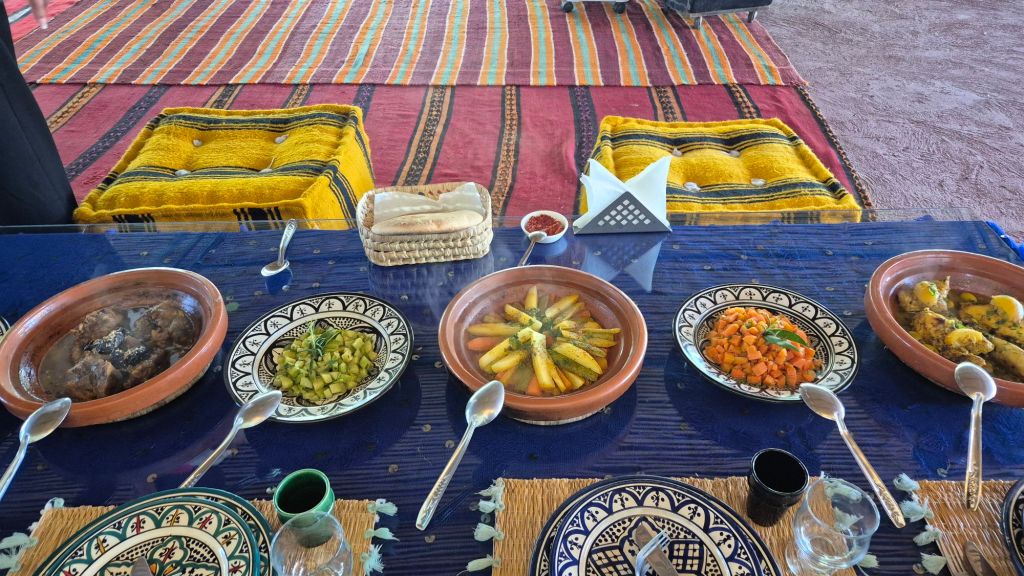 We stopped at an Argan Oil collective on the way here and saw how argan oil is obtained, by hand, from the tree nuts. We did not see any goats in trees (it’s a thing, they eat the argan seed husks) as there has been a lot of rain recently and there is lots to eat on the ground.