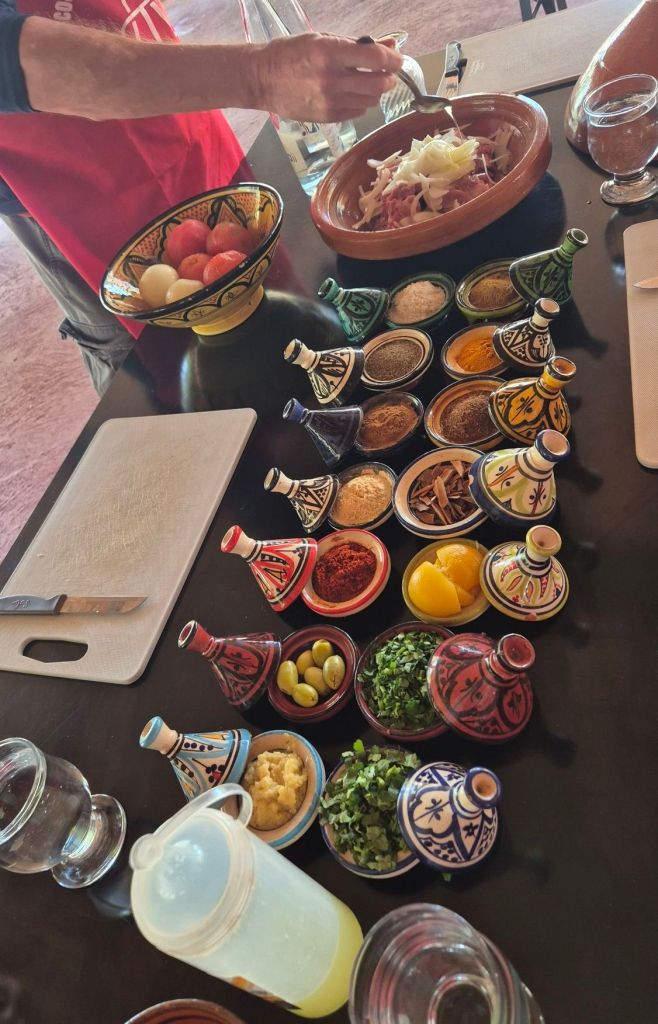 Today we did a cooking class, cooking 3xtagine – lamb & prune, chicken, lemon & olive and vegetable; 3x salads – carrot, zucchini and capsicum & tomato; as well as learning a shortcut way to cook couscous the Moroccan way. (Hint, it’s not adding boiling water and covering for 5 minutes!)