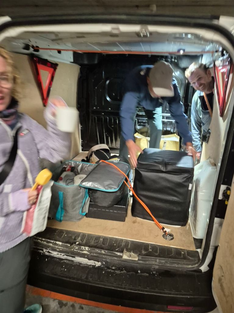 At our hotel, our friends Mark & Paula were waiting with the car they bought for us. Not only did they buy the car, they’ve packed a bunch of mandatory items (yellow vests, flashing light, safety triangles must be carried here), they added a light, a washing line, a gas cooktop, a tent, coffee and essentials, a toilet and even a printer!! (We will need to have printed copies of some car documents that won’t be received for a few weeks!)
