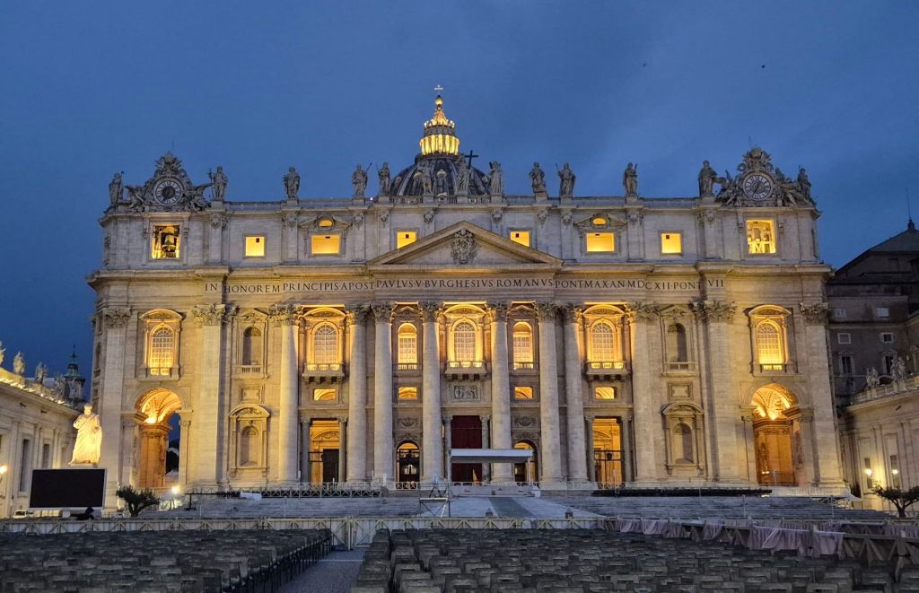 Through the St.Peter’s Basilica Plaza, with a view to the balcony where the Pope stands to do things in front of crowds.