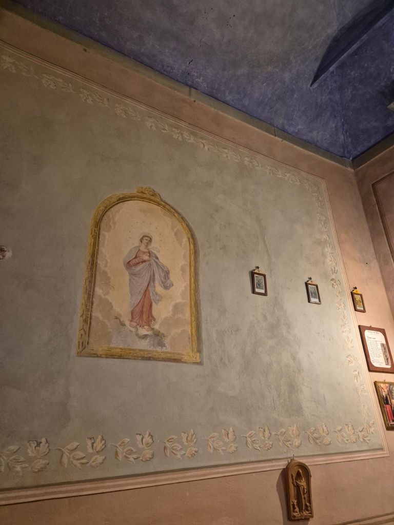 The villa has it’s own chapel that has been used for family weddings and christenings. When the current owners bought it, the chapel was painted white. They washed the walls and discovered the frescos. (Apparently the same in all the upstairs rooms). They believe that as the building was to be commandeered by the Germans in WW2 the then owners painted all the walls white to protect them and the property from damage.
