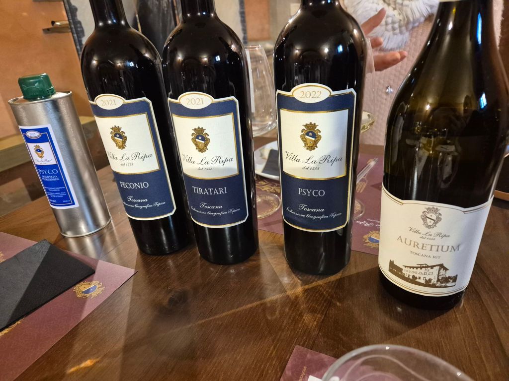 We then moved to the old cellars to have some tastings. A delicious rosé style Spumante, a white wine, a 100% sangiovese, a 75% sangiovese/25% syrah and our favourite, a 50% sangiovese/50% cabernet sauvignon that is named “Psyco” (The owner is a Neurologist and Psychiatrist; one of their other wines is called “Neuro”!)