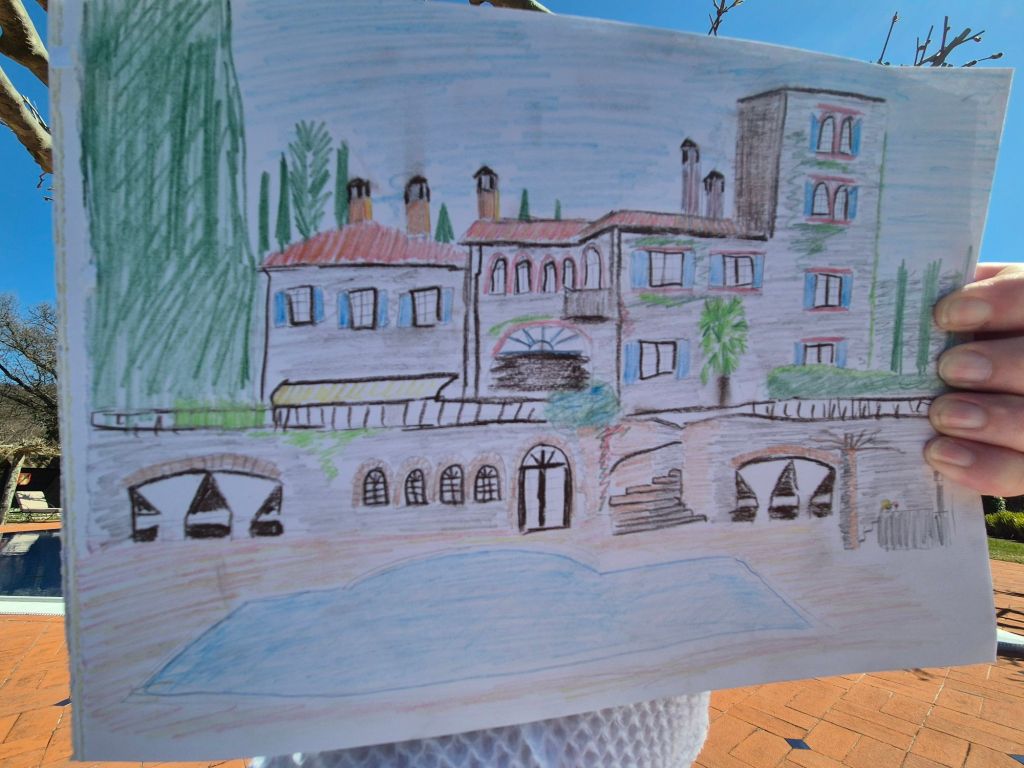 On our third day at the villa we woke to blue skies, no wind and a beaming sun. So even though it was only 13 degrees, it felt much warmer. Warm enough to sit by the pool and get into the hot tub. Someone had left an art kit here (limited set of pencil colours) so I grabbed that and tried to do a drawing of the villa. (Somehow my hands and fingers to the first knuckle got sunburnt!!l